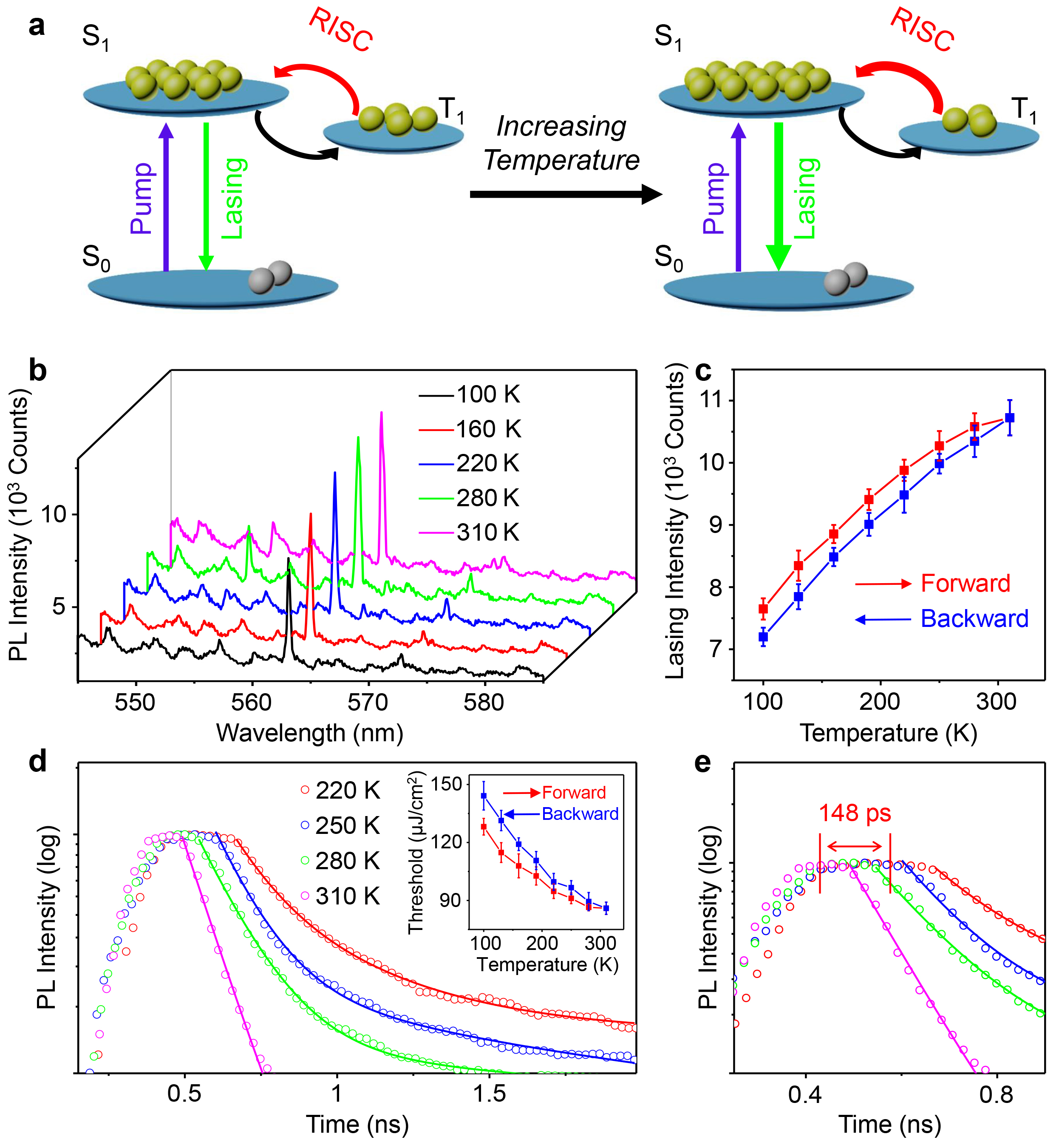 受到热活化延迟荧光(Thermally activated delayed fluorescence, TADF)材料的启发,提出了利用这些材料中独特的反向系间窜越(Reverse intersystem crossing, RISC)过程解决有机固态激光器中的三重态损耗难题的策略。我们根据激光理论筛选出了高发光效率和高RISC效率的TADF体系并与高光学质量的微腔结合,首次在升温过程中观察到了独特的热活化激光现象,直接从实验上证明了体系中的三重态激子可以被RISC过程捕获并用于单重态受激辐射。进一步将这种独特的激光机制应用于更具有挑战性的有机准连续激光领域,成功实现了准连续光泵浦的有机激光(Angew. Chem. Int. Ed. 2020)。这些结果为有机电驱动激光的实现提供了有意义的借鉴。