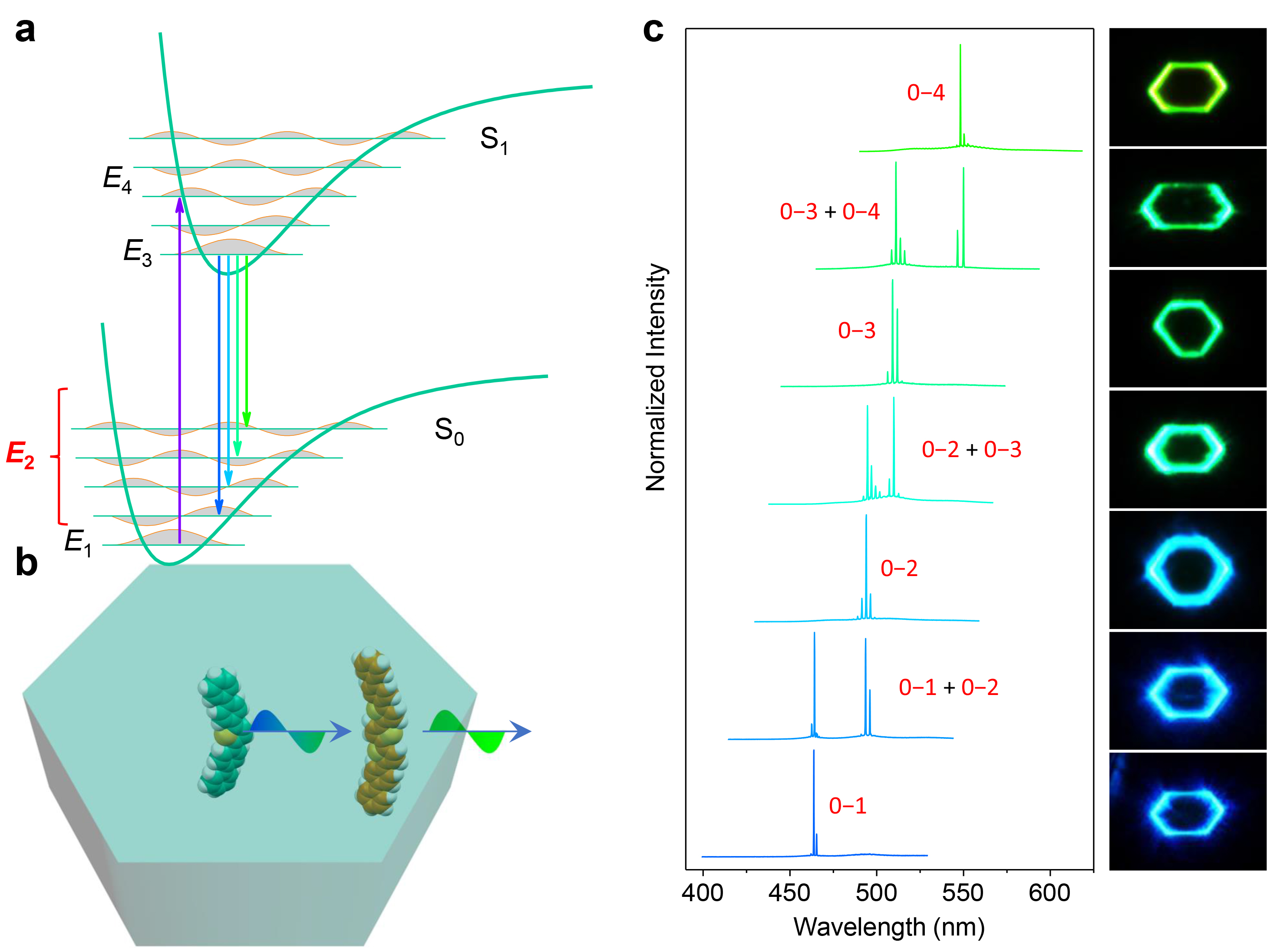 通常有机激光是基于基态(S0)和第一激发态(S1)不同的振动能级形成的准四能级结构实现受激辐射。有机材料丰富的激发态过程为构建更加有利于激光出射的真正四能级结构提供了可能。我们选择了具有激发态分子内质子转移(Excited-state intramolecular proton transfer, ESIPT)过程的典型四能级分子体系,制备了高质量的一维单晶谐振腔。基于分子在基态和激发态之间的烯醇式(E)与酮式(K)互变,构筑了完整的四能级体系,从而实现了波长可切换的低阈值微纳激光(Angew. Chem. Int. Ed. 2015)。