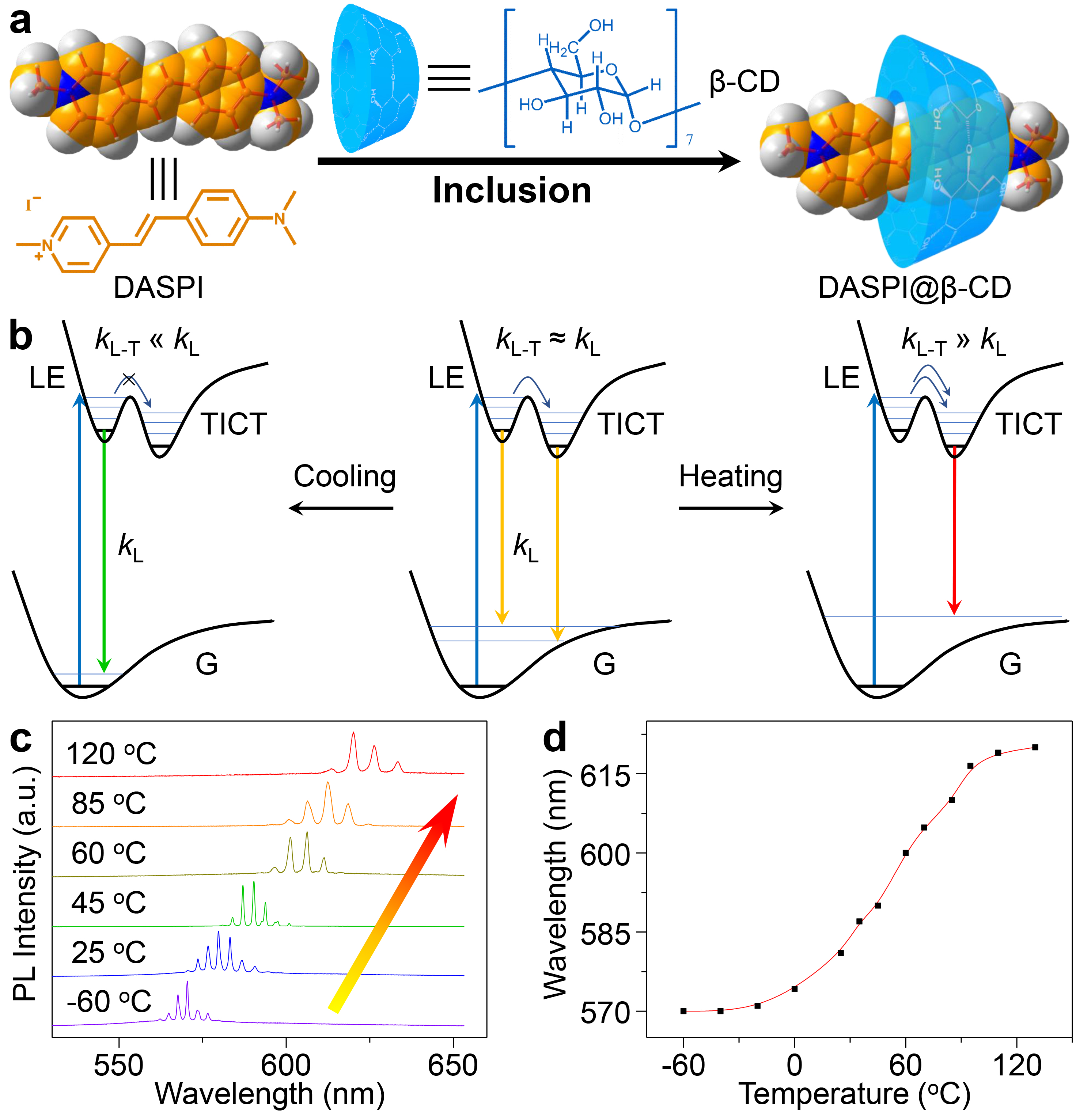 进一步,我们设计了具有分子内电荷转移(Intramolecular charge transfer, ICT)特性的化合物作为增益材料,基于这类化合物特有的双上能级结构,利用两个能级结构和跃迁过程对环境的特定响应构筑新型激光材料。首先通过超分子限域体系设计,实现了两个上能级布居数的控制。进一步通过稳态与瞬态光谱分析,提出了基于两个上能态协同增益的全新激光产生机制,这种机制提供了一种通过控制两个上能态间的粒子数分布来调控增益区间的新思路。基于此,通过实时改变环境温度来控制分子内电荷转移过程,有效地调控了有机超分子微晶的增益区间,进而实现了发射区间连续可调的宽谱微纳激光器(J. Am. Chem. Soc. 2016; Adv. Mater. 2016)。